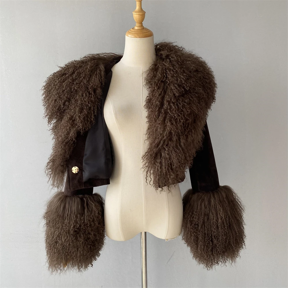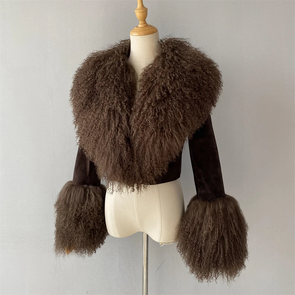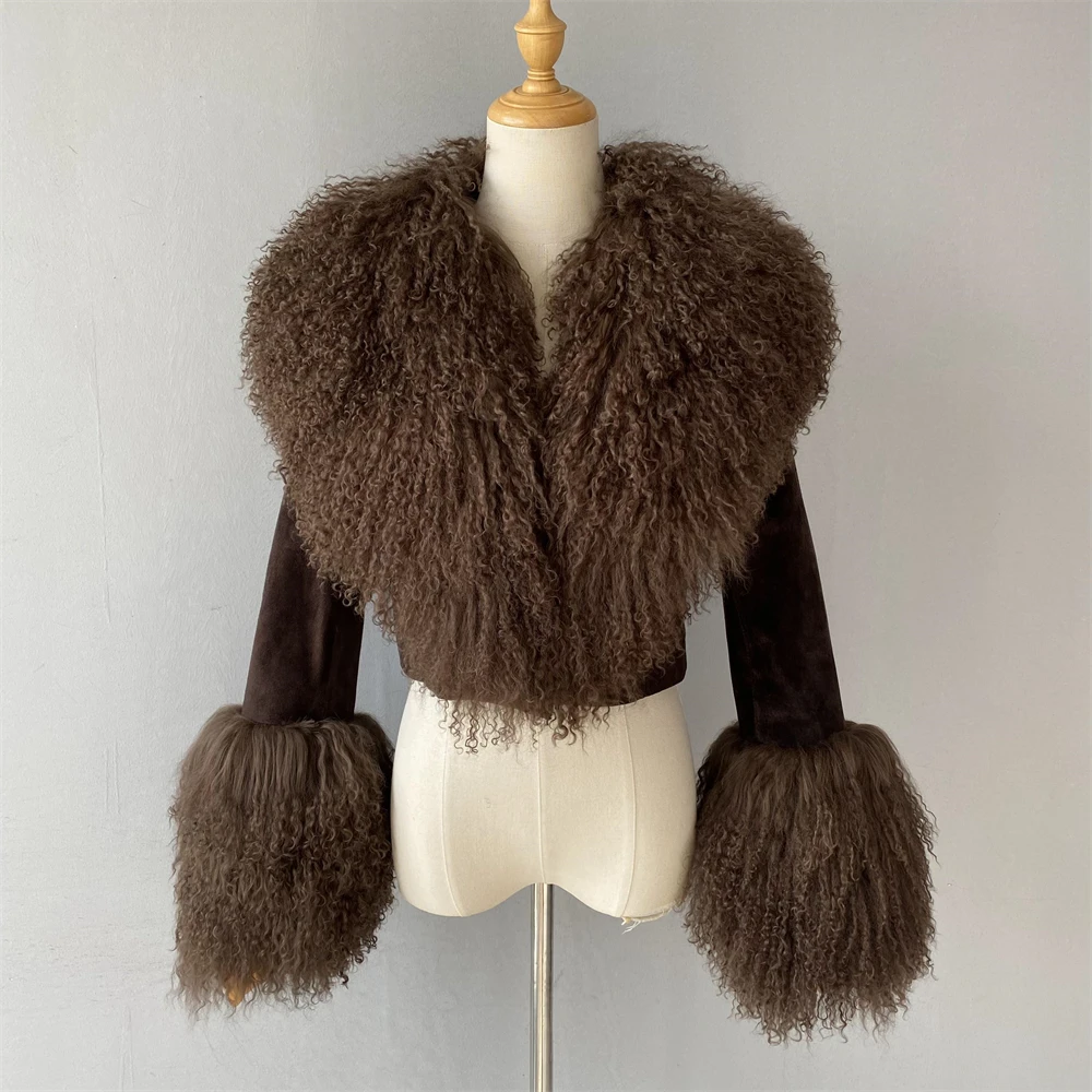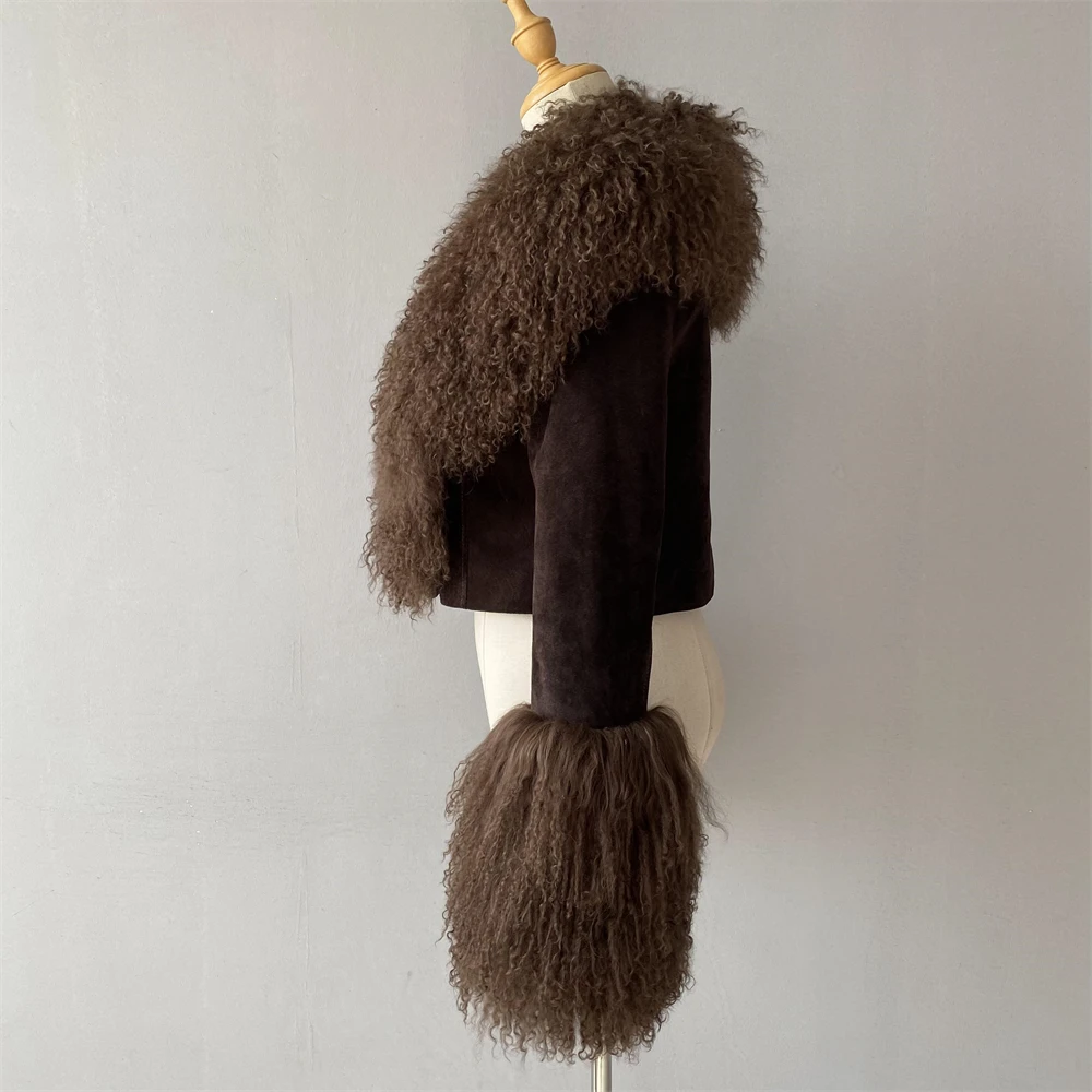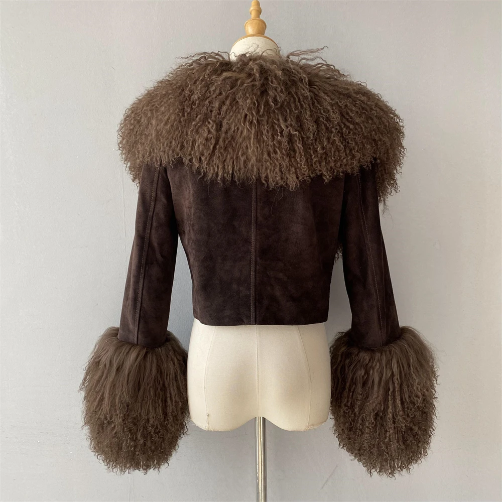 Big Luxury Natural Mongolian Lamb Fur Collar Suede Sheepskin Coat Warm Ladies Autumn Soft Cropped Custom Leather Jacket Woman