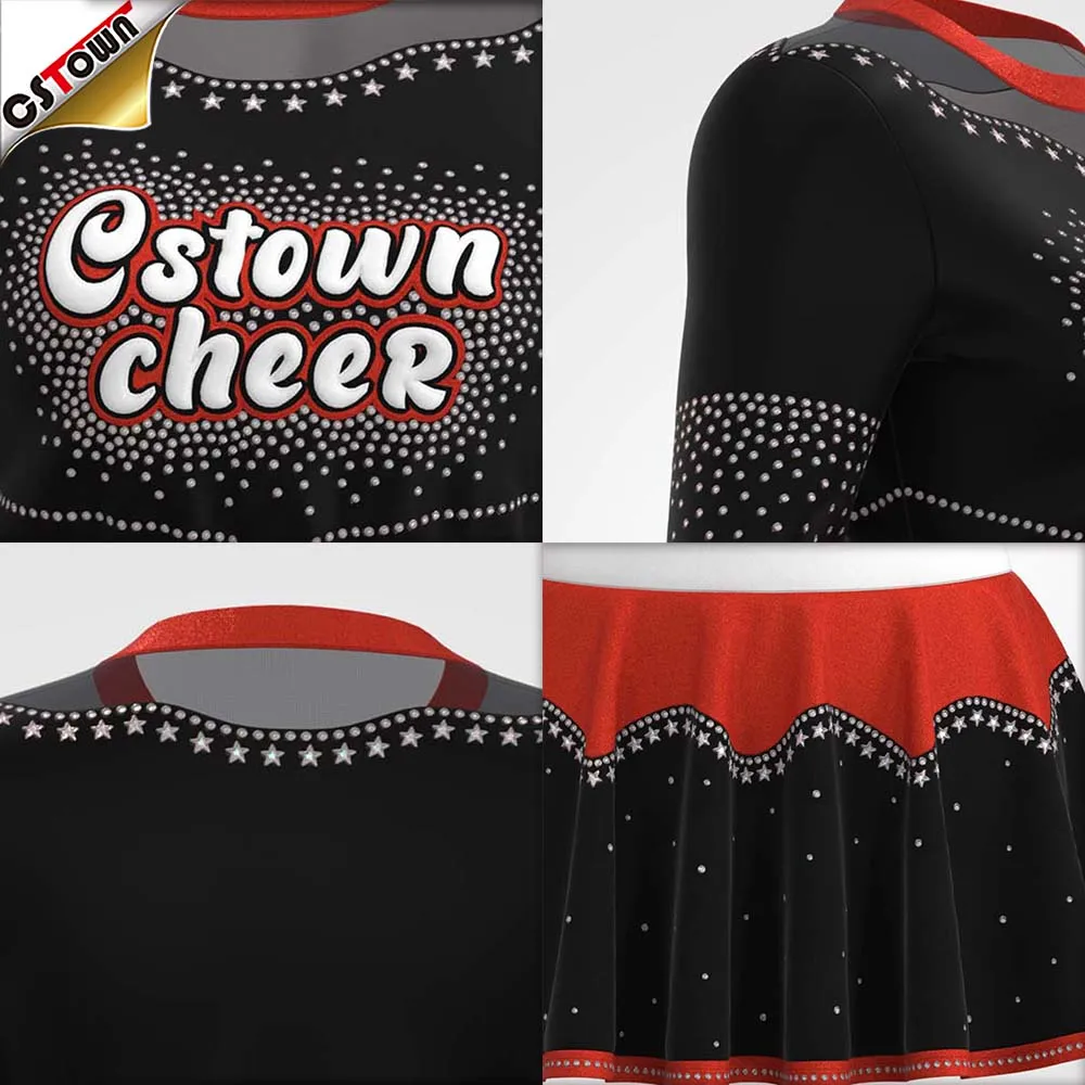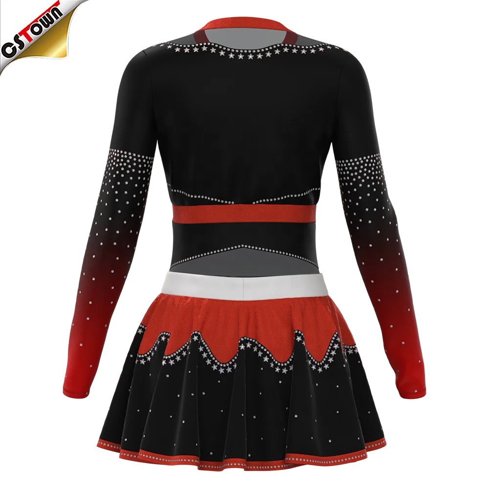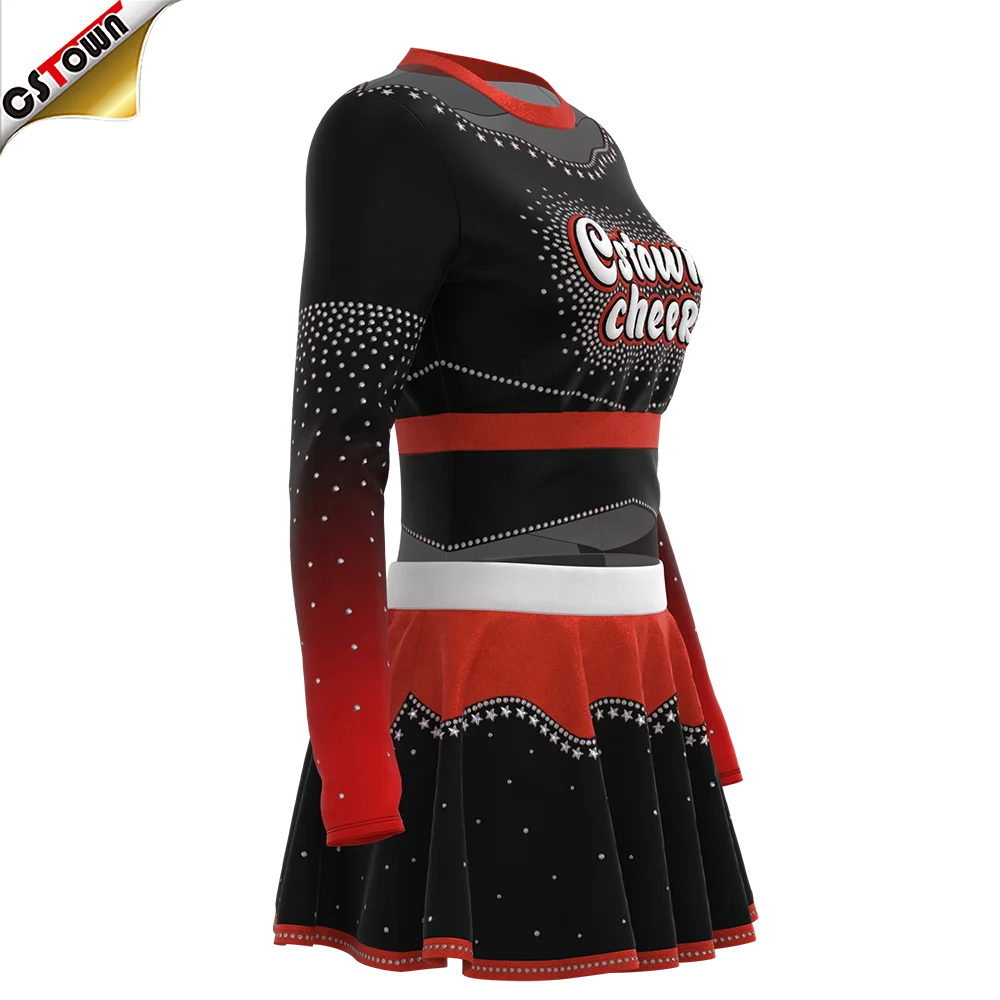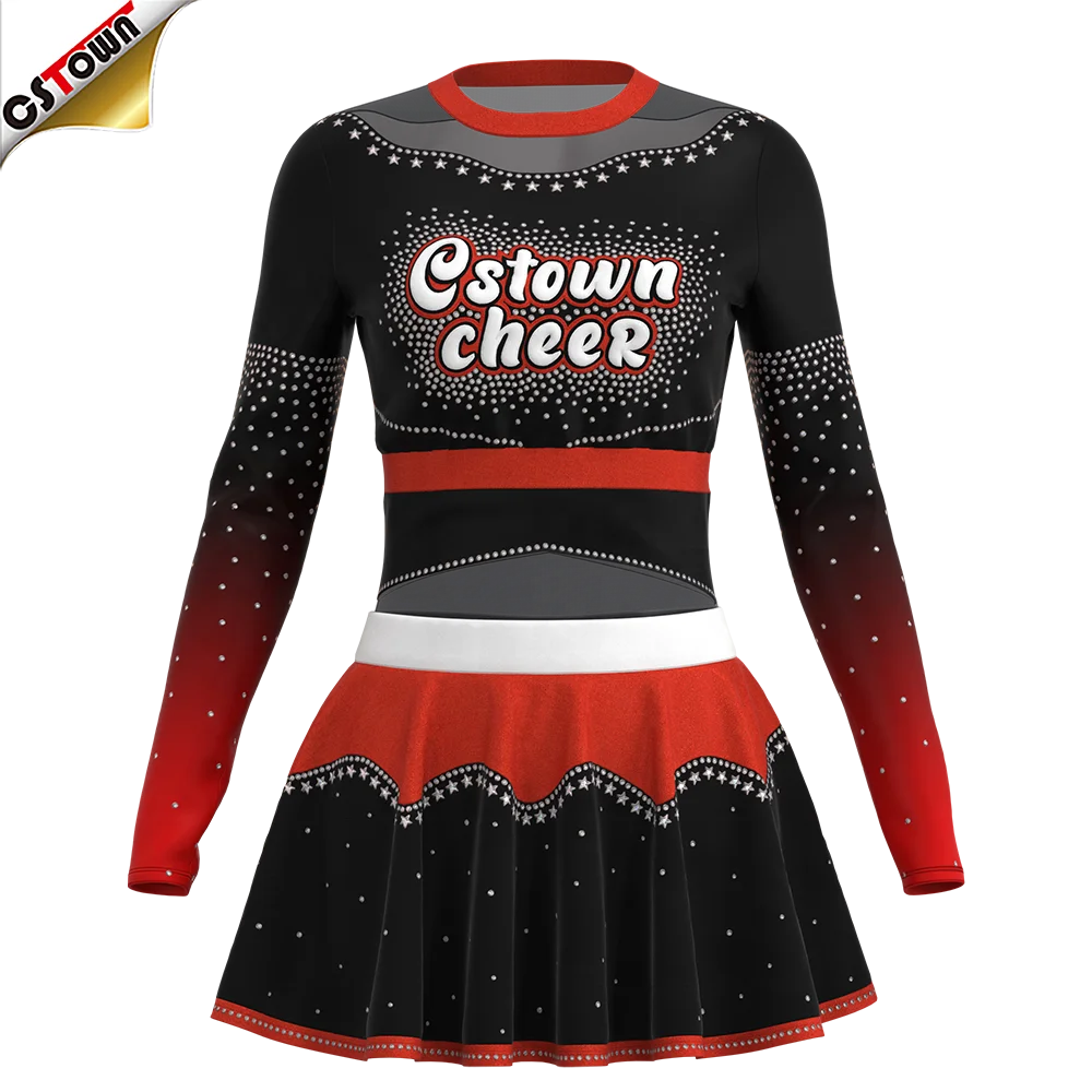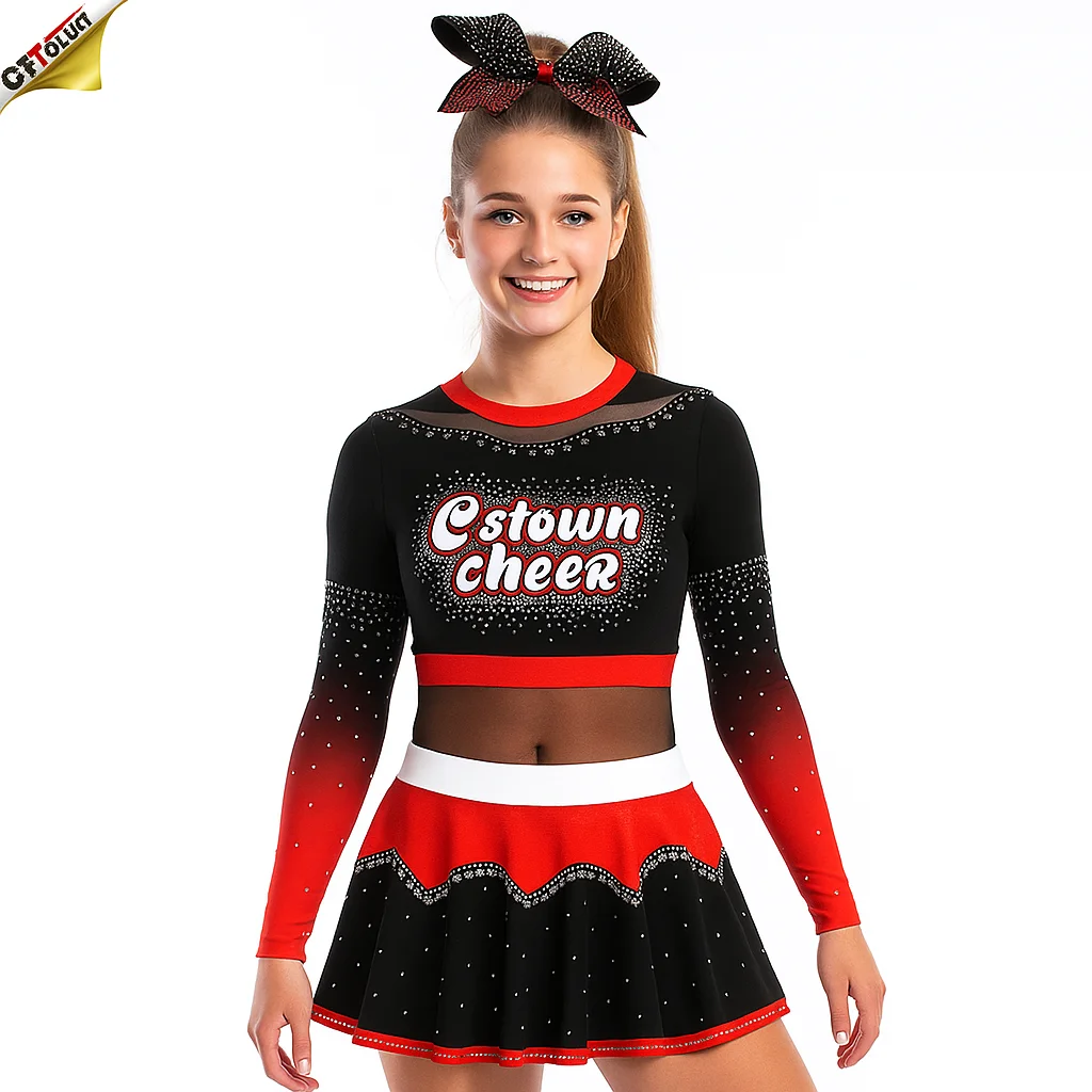 Red Black Gradient Cheerleading Dresses for Women with Sparkle Mesh and Cheerleader Skirt Design